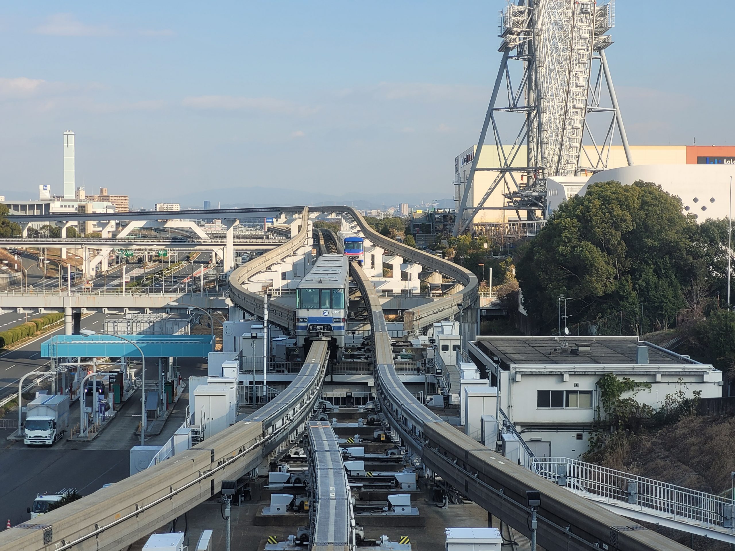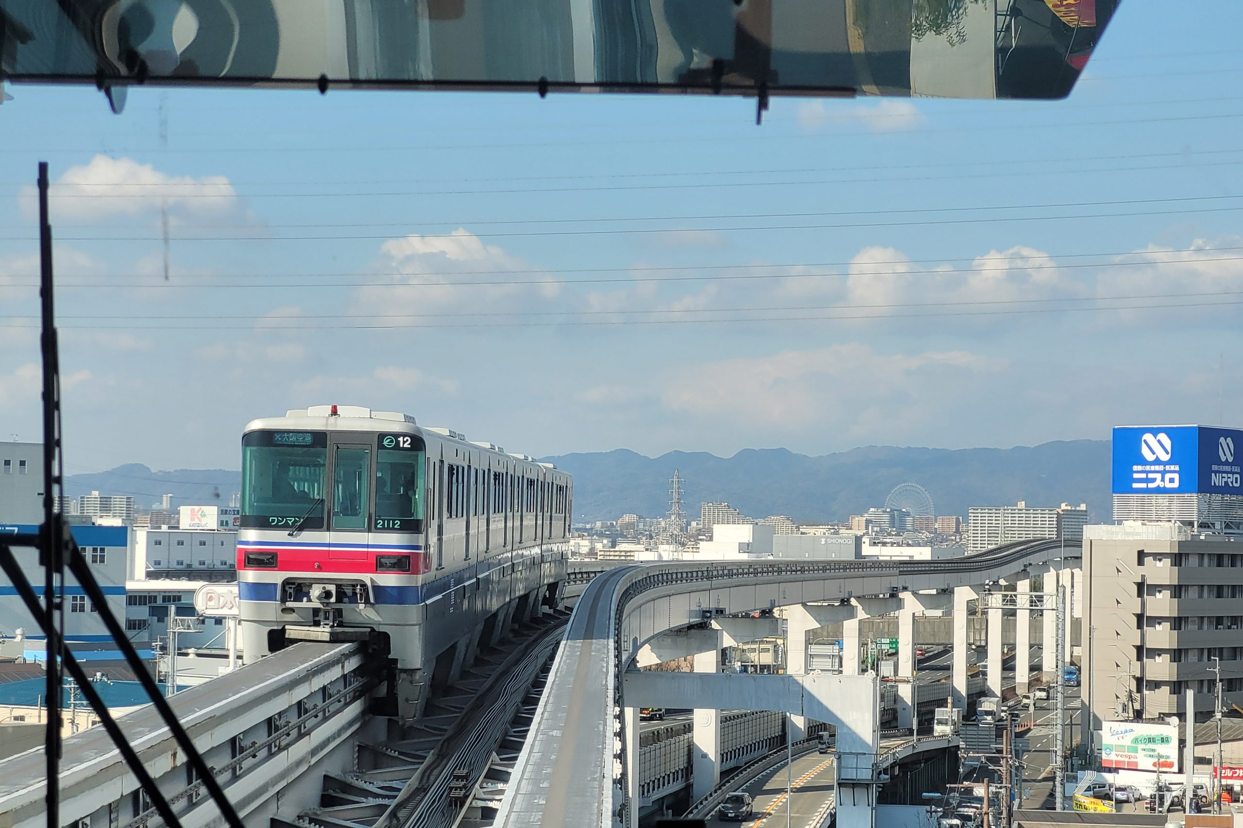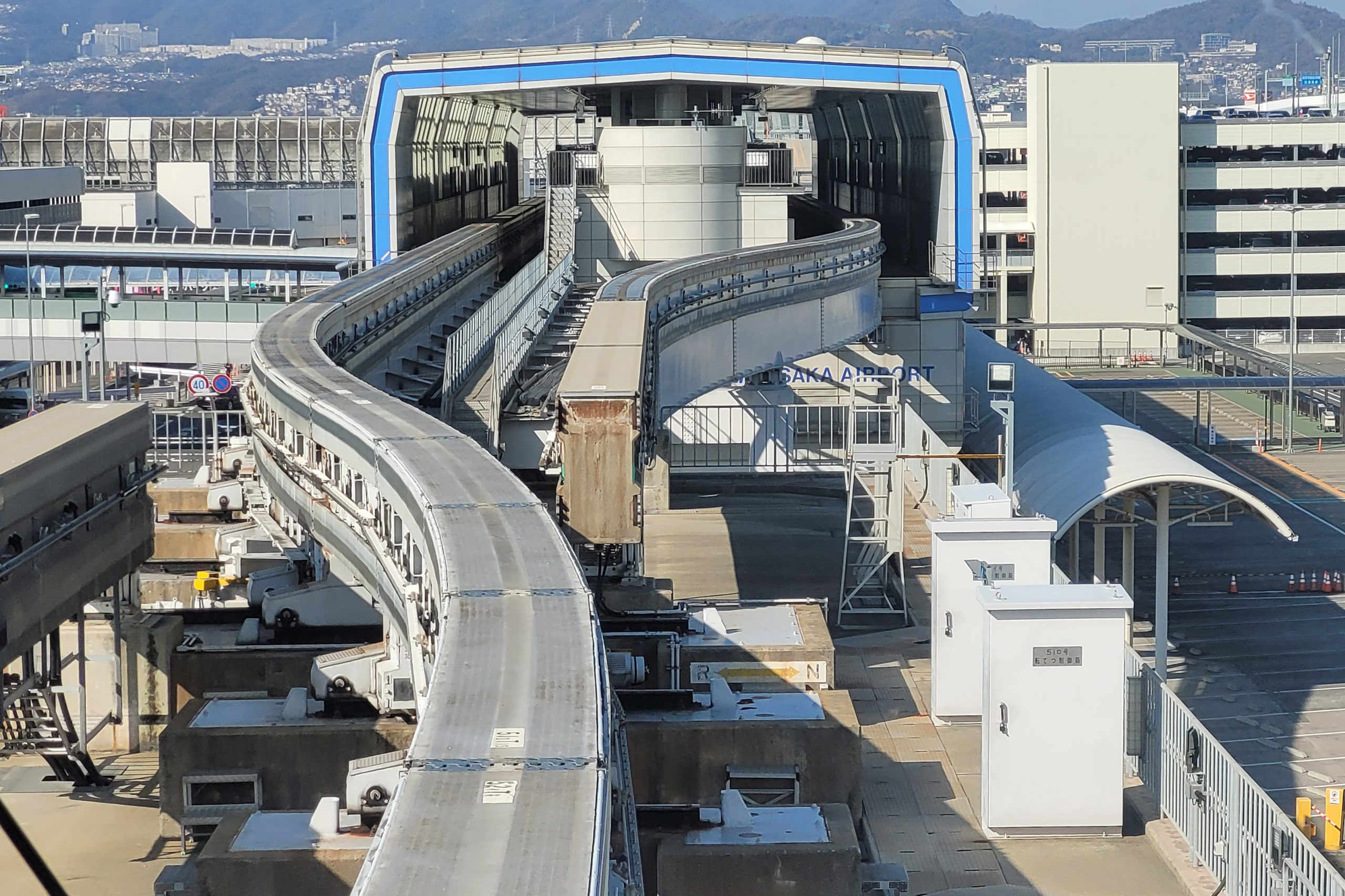 The Osaka Monorail, a pinched-loop system with a main line and branch, connects Itami Airport to multiple subway and train lines and is famous for its track switch at Kadoma-shi Station. With 121,441 passengers per day in 2023, the newer trains offer panoramic views through large windows making them a standout feature of the local transport network in northern Osaka.