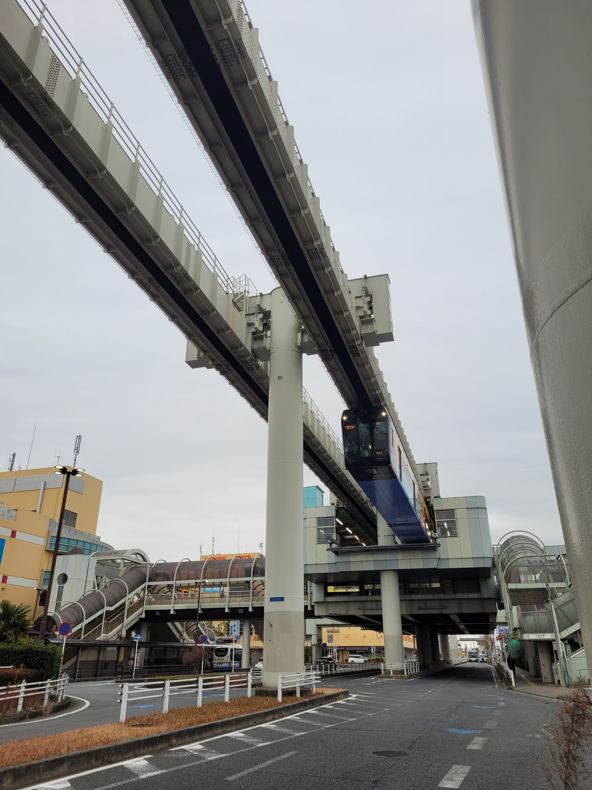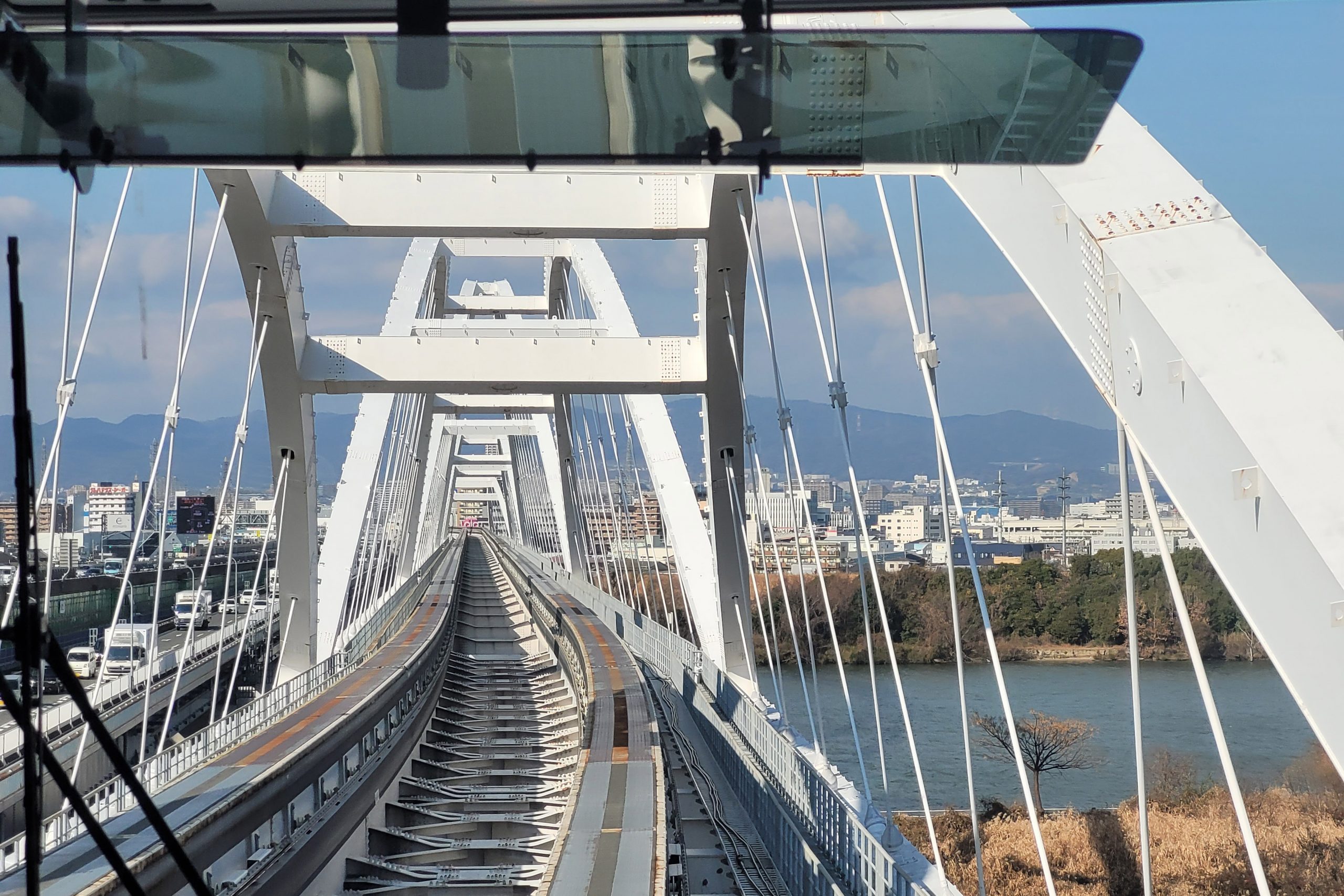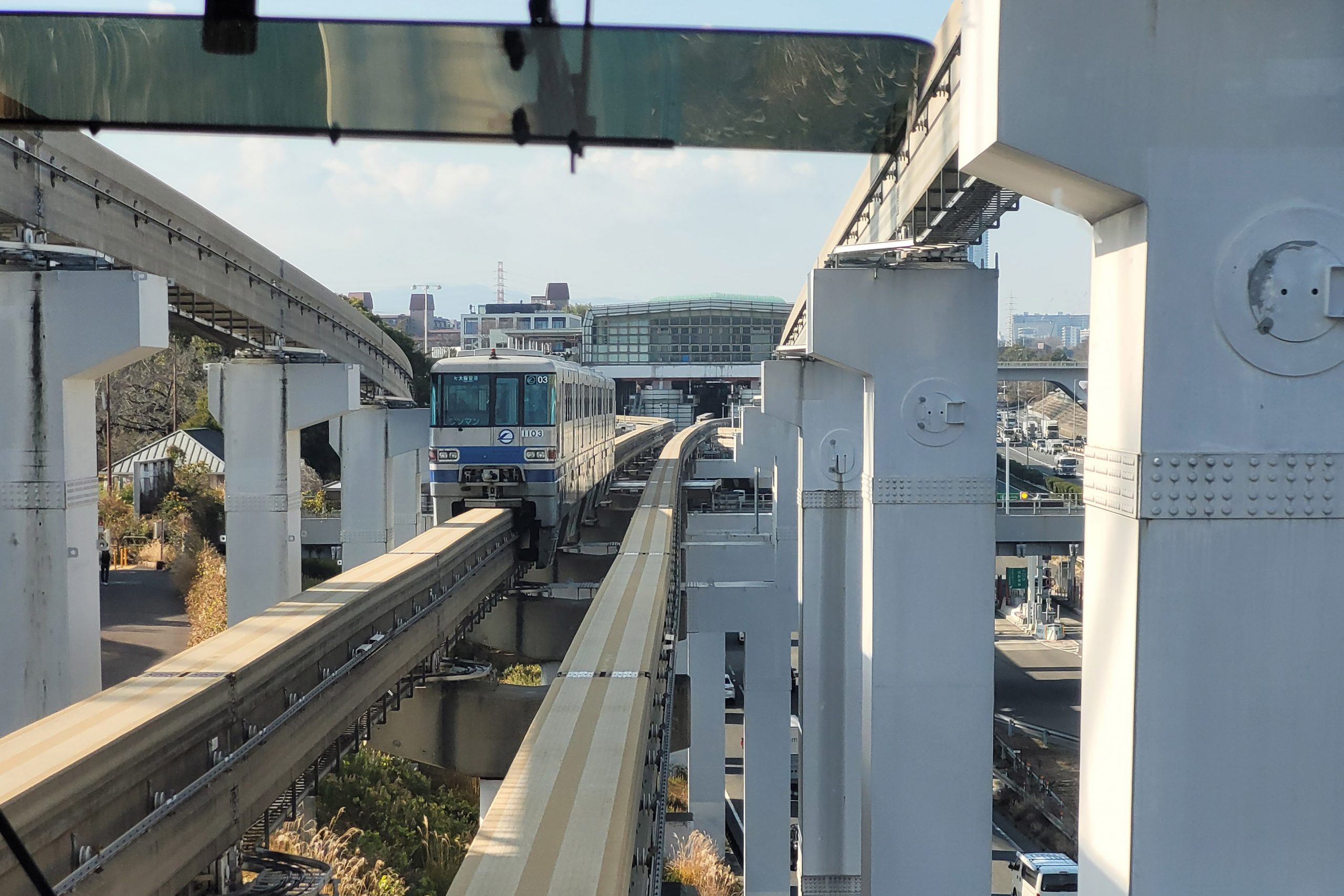 The Osaka Monorail, a pinched-loop system with a main line and branch, connects Itami Airport to multiple subway and train lines and is famous for its track switch at Kadoma-shi Station. With 121,441 passengers per day in 2023, the newer trains offer panoramic views through large windows making them a standout feature of the local transport network in northern Osaka.